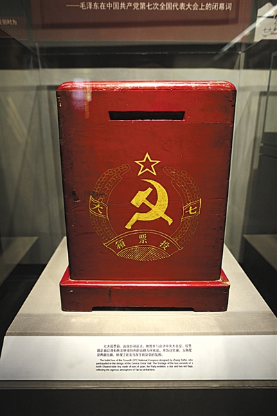 展览展出了中共“七大”投票箱。这个投票箱是由张协和设计的。1945年,中共中央为筹备“七大”,从驻延安的多个单位中抽调大量人员参与筹备工作。会场内大量木制器具均由张协和负责牵头设计制作。他亲自为大会设计3个投票箱方案,最终选定“第一图”。其整体采用有中国特色之吉庆大红底色配以黄色图案之设计,正面以具有陕北地域特色的谷穗为环状底,并饰以党徽、五角星及两面红旗,并用文字注明“七大投票箱”。为了加强肃穆的气氛,投票箱下面还加了两寸高的底托。至今仍保持鲜明艳丽,用西洋红绘制的彩色效果图中,仍可再现延安当年生机勃勃的氛围。