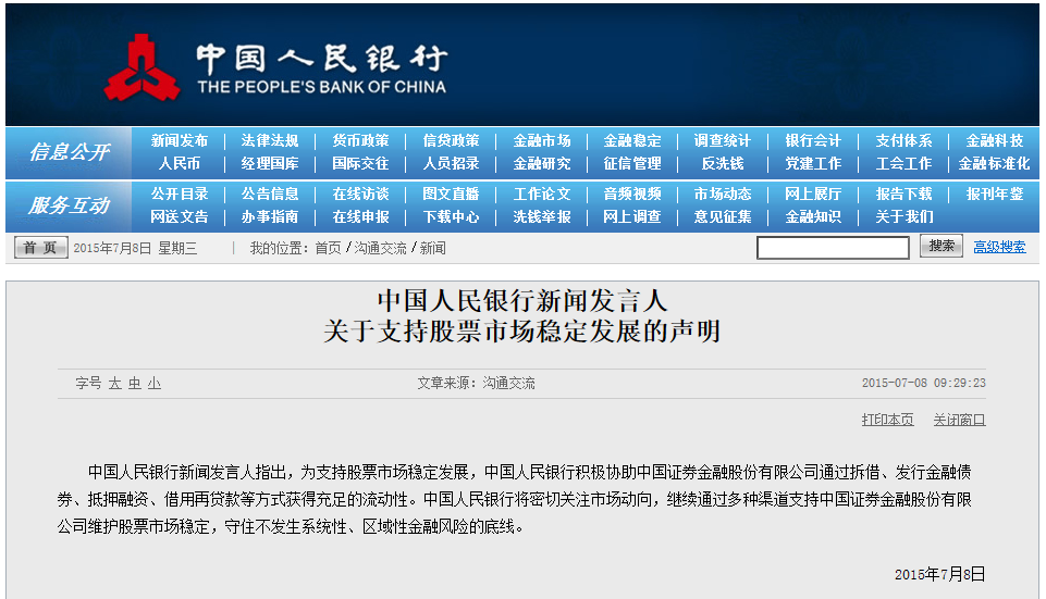 中国青年网北京7月8日电(记者 周围围)8日上午,中国人民银行官方网站发布关于支持股票市场稳定发展的声明,央行新闻发言人指出,为支持股票市场稳定发展,中国人民银行积极协助中国证券金融股份有限公司通过拆借、发行金融债券、抵押融资、借用再贷款等方式获得充足的流动性。中国人民银行将密切关注市场动向,继续通过多种渠道支持中国证券金融股份有限公司维护股票市场稳定,守住不发生系统性、区域性金融风险的底线。