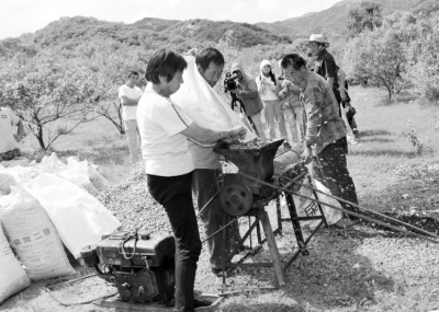 为提高山杏去皮的工作效率,推进机械化生产,内蒙古自治区敖汉旗四家子镇积极引进山杏快速去皮机,可以将刚采摘的山杏即时去皮。一台机器一天最多可加工10000公斤山杏,出杏核3000余公斤,而且杏核质量好,产量可提高5%。图为该镇长力哈达村农民在山里用去皮机给刚采摘的山杏去皮。 李井刚摄