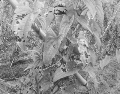 山药炭疽病可侵染藤茎、叶。藤茎染病始于茎基部,初产生梭形或不定形褐色病斑,病斑逐渐向上发展,严重时病斑融合成片致整株枯死。叶部染病有急性型和慢性型两种,慢性型病斑较大,发病较慢。急性型发病快,危害重,多在叶柄与叶片或叶柄与茎蔓交界处出现不规则的褐色病斑,而在叶面上病斑较少,数日后叶片即脱落,严重时几天时间叶片掉光,造成严重减产。