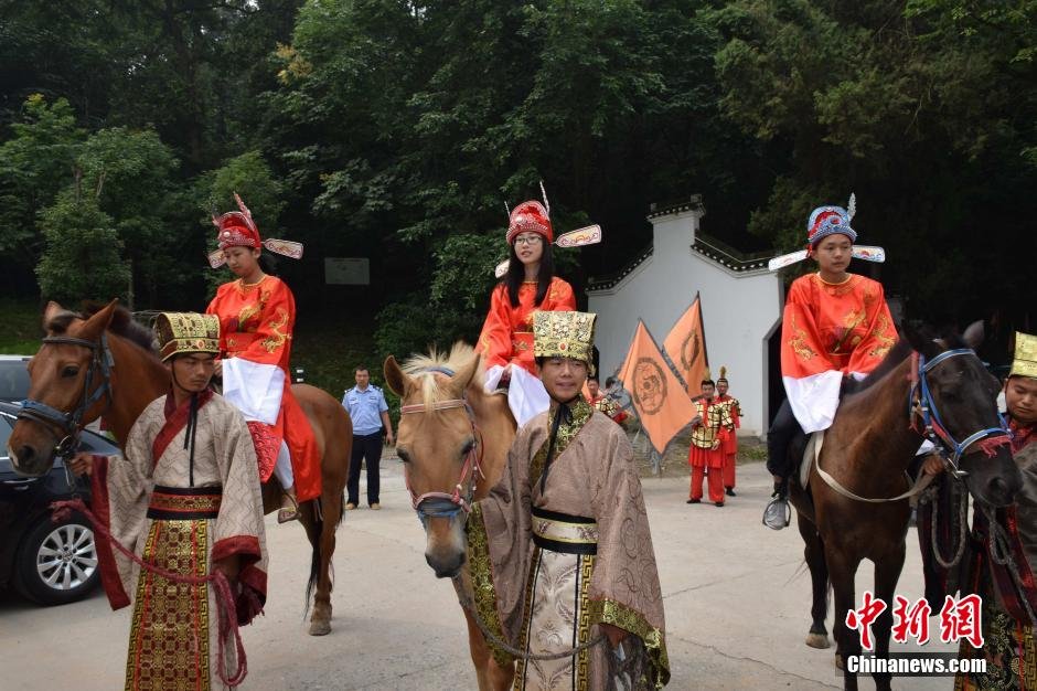 湖北高考状元榜眼身着状元服骑马游园引游客围观