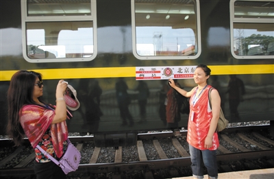 7月10日, 一名乘客在北京东站站台上与即将发往天津蓟县的列车合影。昨日,京蓟城际快速列车正式开通运行。列车始发站为北京东站,终点站为蓟县火车站,使用空调车底,一站直达,早晚各开行一对,全程运行59分钟,票价为14.5元。据了解,北京至蓟县之间的列车具体车次分别为K7783/4次和K7787/8次。新京报记者 王贵彬 摄
