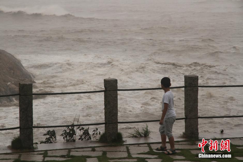 7月10日,浙江温岭石塘千年曙光园的平台上有百名本地人以及外地人,拖家带口在海边观浪。今年第9号超强台风"灿鸿"正逐渐向浙江省沿海靠近,台风还没来,台州温岭石塘已经掀起了巨浪。中新社发 张茵 摄
