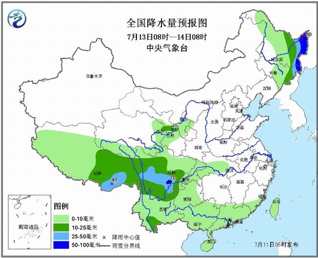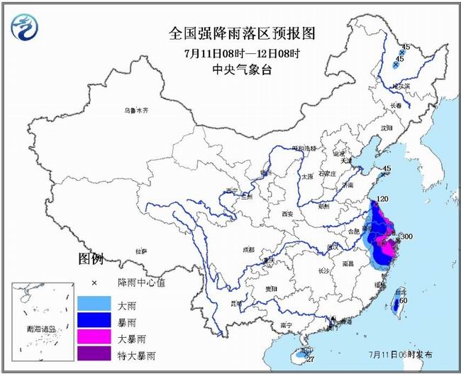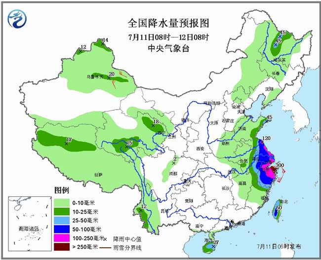 7月11日08时至7月12日08时,浙江大部、上海、江苏中南部、安徽东南部、福建东北部、台湾等地有大雨或暴雨,其中,浙江北部、上海及江苏东部沿海的部分地区有大暴雨(100~250毫米),浙江东北部局地有特大暴雨(250~300毫米),上述局地将伴有短时雷暴大风等强对流天气。新疆北部等地有4~6级风。东海大部海域将有10~12级、阵风13~14级的大风,“灿鸿”中心经过的附近海域的风力将有15~16级、阵风17级以上。