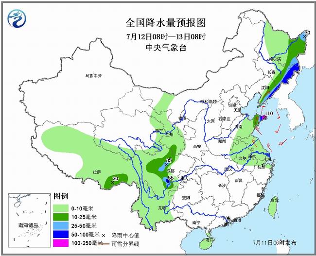 12日08时至13日08时,西藏东南部、川西高原、四川盆地西南部、东北地区东部、山东半岛等地有中到大雨,其中,吉林东部、辽宁东部、山东半岛等地的部分地区有暴雨,山东半岛东部的局部地区有大暴雨(100~110毫米);上述局部地区还将伴有短时强降水、雷暴大风等强对流天气。辽东半岛、山东半岛等地有4~6级风。黄海大部海域、东海北部海域将有7~9级、阵风10~11级的大风,东海南部海域将有8~10级的西南风。