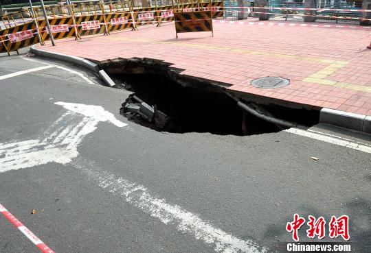塌陷深坑面积约十平方米,深达六米。深坑周围路面也出现不同程度的裂缝。 崔煜坤 摄