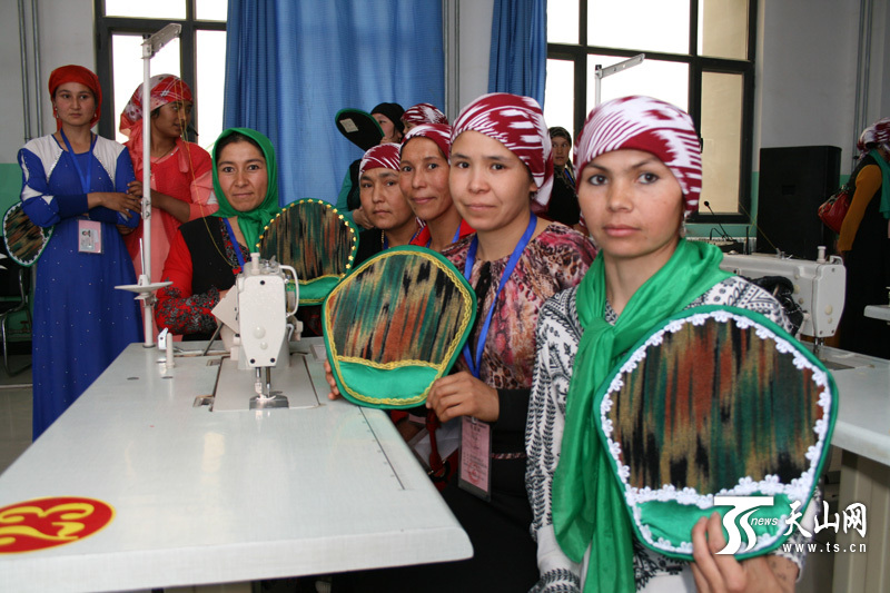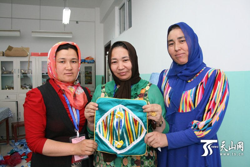 5月24日,和田地区洛浦县,学员展示制作的三角被抱枕。
