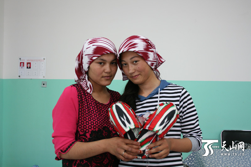 5月24日,和田地区洛浦县,学员们展示制作的艾德莱斯拖鞋。