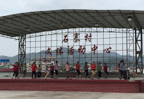 图为石寨村村民在文化服务中心的舞台上跳广场舞