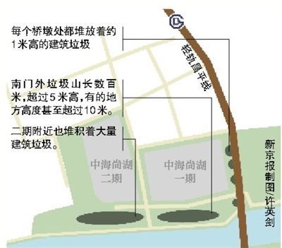 除此之外,小区一期东侧紧邻轻轨昌平线,在轻轨线的一个个桥墩下,还分别堆着约1米高的建筑垃圾。在中海尚湖二期附近,也有一座面积差不多的垃圾山。这些堆放的建筑垃圾距北沙河河岸和别墅居住区的距离均不到50米,而按照《城市卫生设施规划规范》中规定,垃圾卫生填埋堆积距居民点的距离必须大于500米。