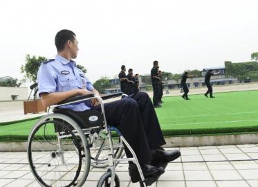 14日,康复中的成都特警朱伟华在训练场观看战友训练。