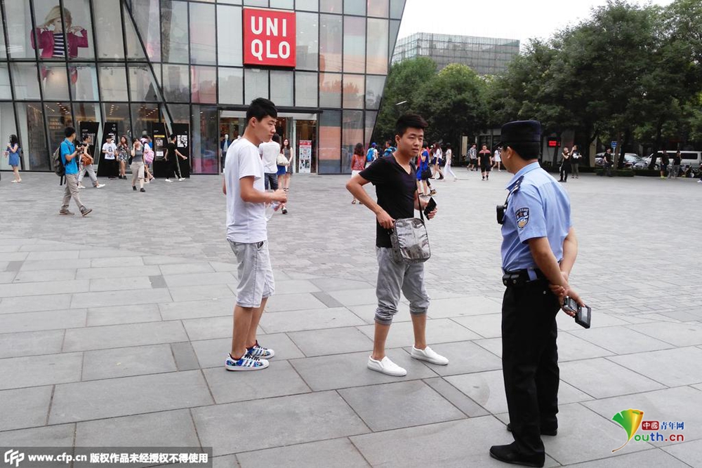 一名警察正在排查两名用手机拍摄优衣库店面的青年。
