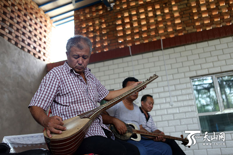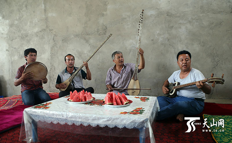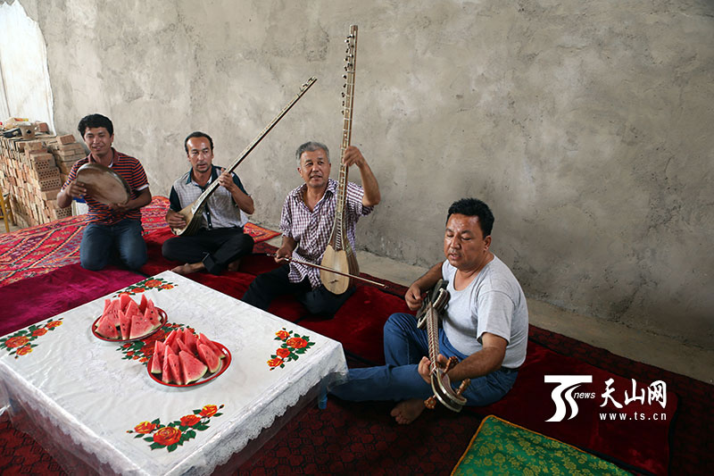 7月10日,苏来曼·阿不都(右二)与村里的民间艺人一起奏唱《十二木卡姆》。新疆经济报记者 李瑞 摄
