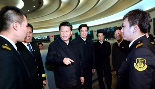 2014年2月25日,中共中央总书记、国家主席、中央军委主席习近平到北京市考察。这是习近平在市轨道交通指挥中心调度指挥大厅向工作人员了解轨道交通运行情况。