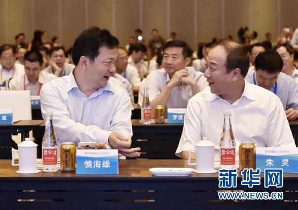 7月17日,新华社副社长慎海雄(左)与中国日报社社长朱灵在第十五届中国网络媒体论坛上交流。新华社记者 梁旭 摄