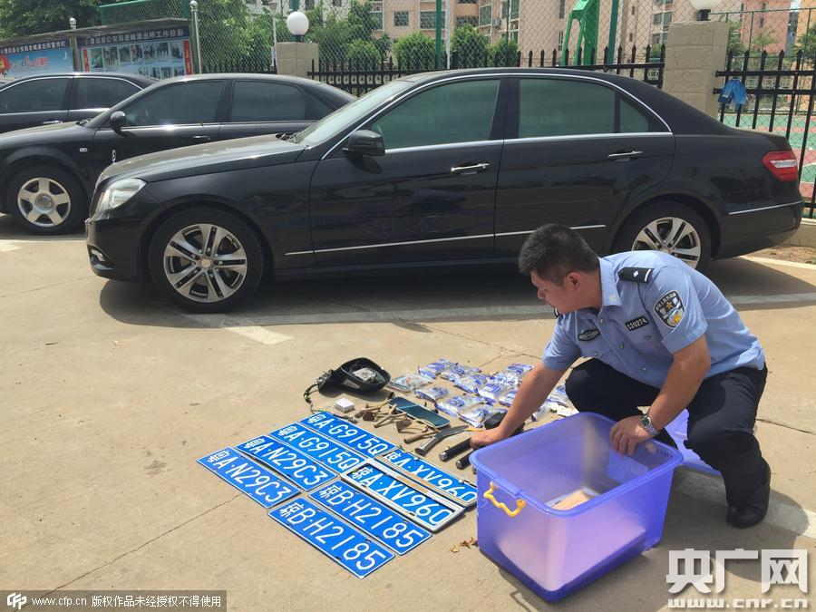 2015年3月至今,该地区连续发生多起以“碰瓷”为手段对受害人进行敲诈勒索或者抢劫的案件,作案手段恶劣,受害者较多,且大多数受害者均是来琼旅游的游客或在琼投资人员,社会影响较大。图为图为警方清点假车牌、Y形弹弓、对讲机等作案工具。