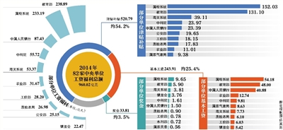 新京报记者统计,昨日至少有82家中央单位“晒”出了2014年度的工资福利支出,总额约960亿元。这82家单位2014年决算支出总额约为11809亿元。以此计算,这些中央单位2014年决算支出总额中,约有8%用于发放工资福利。