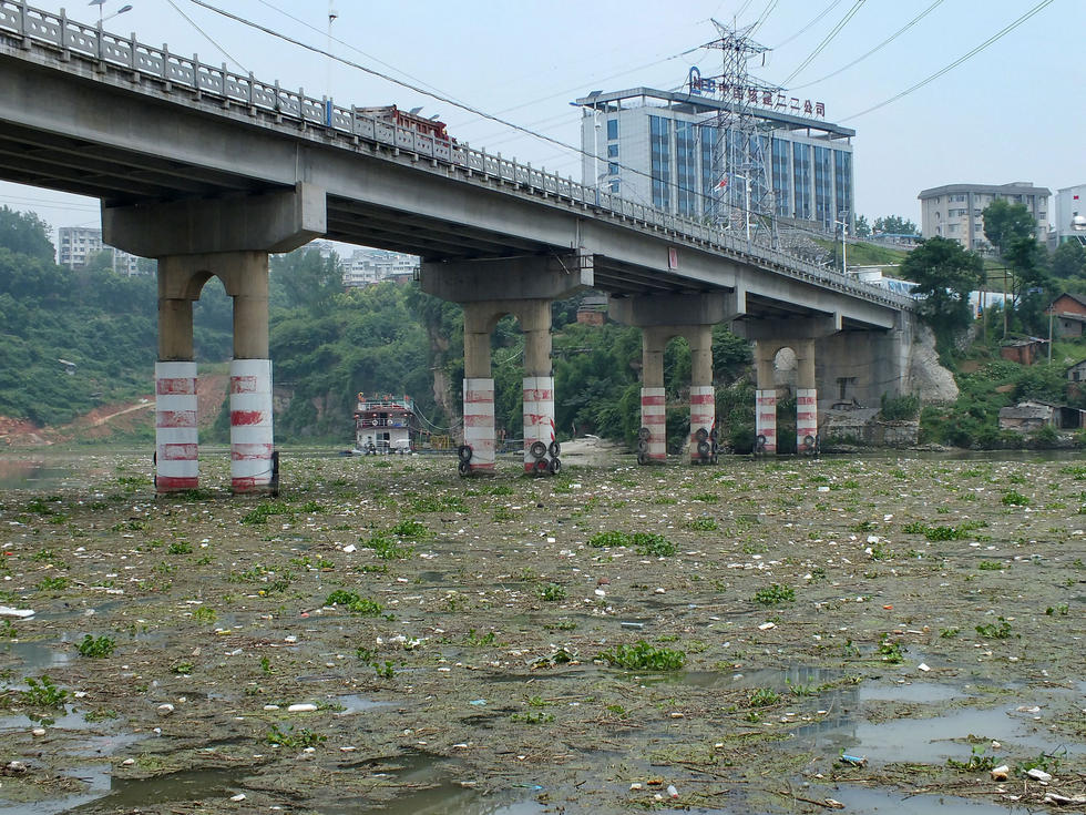 2015年7月17日,湖北宜昌,长江支流黄柏河中国核建22公司附近河段,水葫芦、浮萍、生活垃圾等漂浮物聚集。