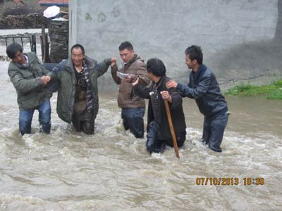 图为2014年罗州仁青和同事在格尔登玛村抗洪抢险。