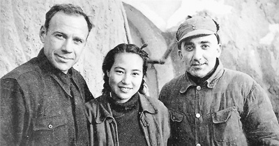 马海德夫妇在他们的窑洞前与苏联医生阿洛夫(左一)合影。