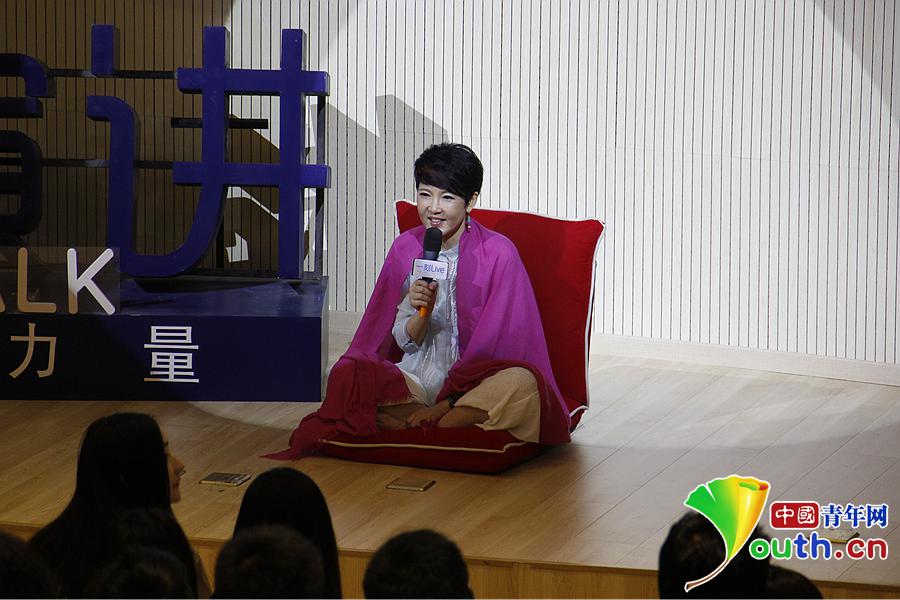 “身心灵”作家张德芬在演讲现场席地而坐,在“一刻演讲”分享了自己生命中最特别的一刻。 中国青年网记者 隗功臣 摄