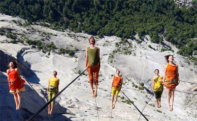 近日,美国某舞蹈团的几名成员在美国约塞米蒂国家公园的一处崖壁上翩翩起舞,吸引了众多目光。照片中,该舞蹈团的几位成员借助绳索的力量,在沿绳下滑的瞬间摆出优美的舞姿,艺术感十足。他们此前曾在西雅图的太空针塔上做过类似的尝试。