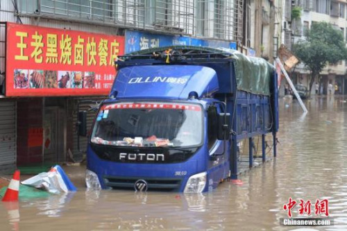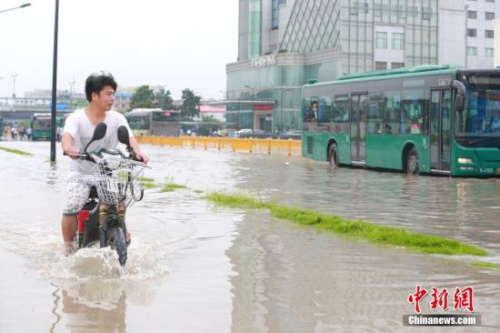 7月23日,武汉暴雨渍水严重,导致的部分路段严重渍水,也给当地民众出行造成影响。中新社发 张畅 摄