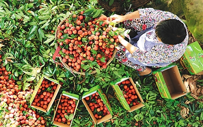 目前,四川泸州市合江县晚熟荔枝大量上市,被誉为“中华名果” 的“带绿”荔枝走俏市场,每公斤价格在160元—200元之间。这种荔枝因果皮缝合处有一条绿色的线,恰似一根腰带而得名。图为7月25日,四川泸州市合江县柳马埂村村民在分捡“带绿”荔枝。