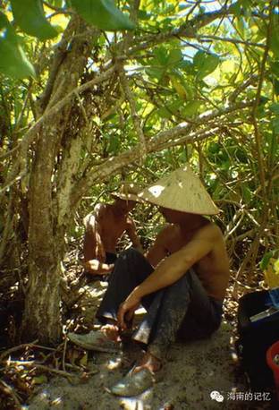 考察队员在甘泉岛的树丛中休息。岛礁考察是很辛苦的工作,天气酷热,每人背的一壶凉开水根本不够一天喝的,中午也只能吃自带的馒头和咸菜。实在热的没办法,只好反复到海水里去泡一泡降温。摄于1991年6月。