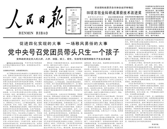 1980年9月26日,《人民日报》头版刊发党中央《关于控制我国人口增长问题致全体共产党员、共青团员的公开信》。