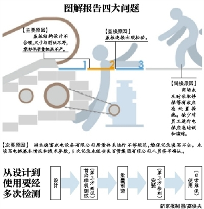 报告显示,申龙电梯股份有限公司该类型产品涉及的盖板结构设计不合理,容易导致松动和翘起,安全防护措施考虑不足;申龙电梯股份有限公司涉及事故的3块盖板尺寸与图纸不符。有关制造单位对出厂产品零部件质量把关不严,导致产品安装成型后三盖板间水平活动范围过大。
