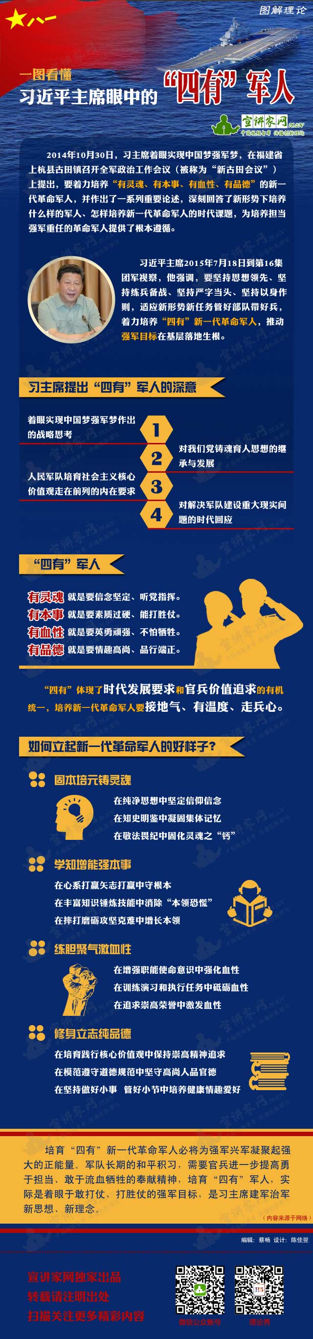 核心提示:培育“四有”新一代革命军人必将为强军兴军凝聚起强大的正能量。军队长期的和平积习,需要官兵进一步提高勇于担当、敢于流血牺牲的奉献精神,培育“四有”军人,实际是着眼于敢打仗、打胜仗的强军目标,是习主席建军治军新思想、新理念。