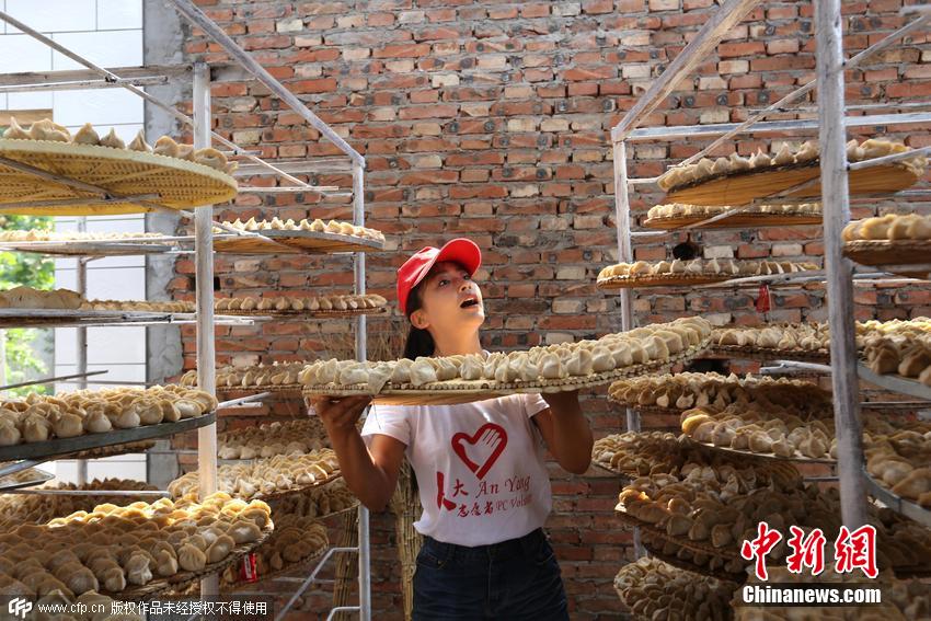 图为河南省安阳县北郭乡武庄村“千人饺子宴” 现场,来自市人大的一名青年志愿者正在把包好的饺子凉到架子上。 图片来源:CFP视觉中国