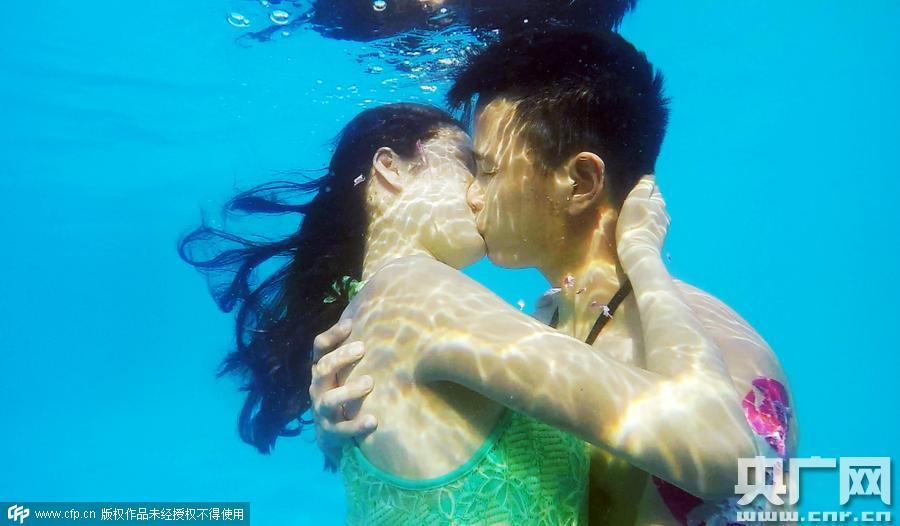 2015年08月02日,武汉市,一场浪漫温馨的水下接吻大赛在武汉玛雅海滩上演。11对身着清凉泳装的情侣在水中展开火辣的接吻大赛,最终一对结婚11年的夫妻以1分02秒的成绩夺得冠军。