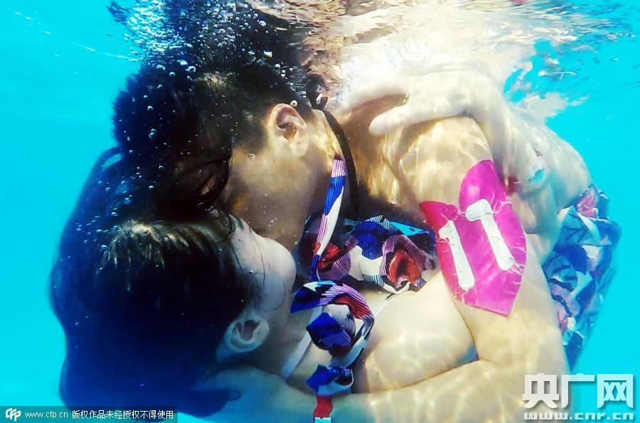 2015年08月02日,武汉市,一场浪漫温馨的水下接吻大赛在武汉玛雅海滩上演。11对身着清凉泳装的情侣在水中展开火辣的接吻大赛,最终一对结婚11年的夫妻以1分02秒的成绩夺得冠军。