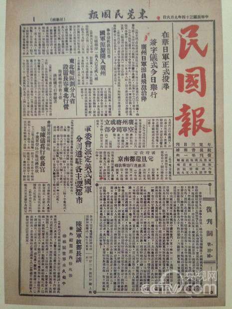 在华日军今日投降-《民国报》1945年9月6日 复刊号(央视网记者 王莉莉 摄)