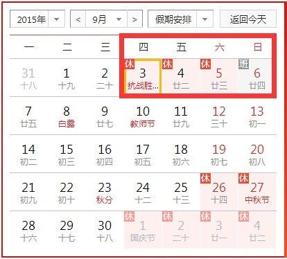 5月13日,国务院发出《关于中国人民抗日战争暨世界反法西斯战争胜利70周年纪念日调休放假的通知》。《通知》明确,为使全国人民广泛参与中央及各地区各部门举行的纪念活动,2015年9月3日全国放假1天。为方便公众安排假日期间生产生活,特作如下调休:9月3日至5日调休放假,共3天。其中9月3日(星期四)放假,9月4日(星期五)调休,9月6日(星期日)上班。