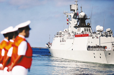 图为当日上午导弹护卫舰三亚舰从三亚某军港解缆启航。