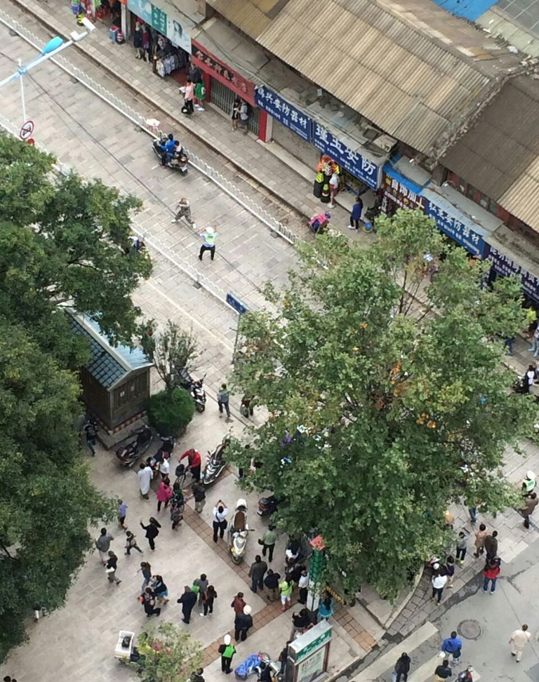 经初步调查,该车驾驶人杨某某,云南曲靖人。所驾车登记号牌为云D26369。目前,此案正在调查处理中。图为警察与持刀司机对峙现场。