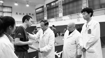 50多年,一年四季,他骑自行车往返单位和运动队。边看病、边学习是田得祥始终不变的理念。“下队观察运动员训练,从医学角度给予合理建议。有些动作该怎么做,哪些动作容易受伤,都要和队员交流。”他向运动员学习体育知识,再运用这些知识丰富自己的医疗理论。