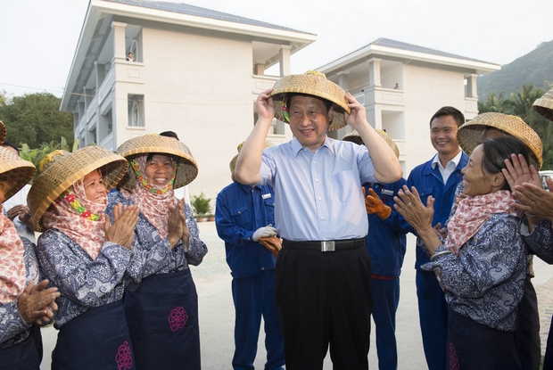2013年4月8日至10日,中共中央总书记、国家主席、中央军委主席习近平在海南考察工作。9日下午,习近平在亚龙湾兰德玫瑰风情产业园高兴地戴上黎族群众递上的斗笠。