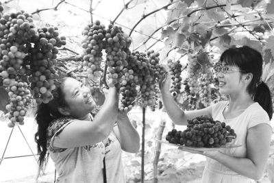 8月2日,种植户刘翠果正在河南平顶山市艺隆生态园里采摘夏黑葡萄。近年来,该生态园通过发展绿色生态果蔬种植和养殖,观光农业和生态种植养殖联姻,形成“猪(禽)-沼-菜(果)”的循环生态农业的产业链,种出的果蔬口感好,销路畅。 刘迎旭摄