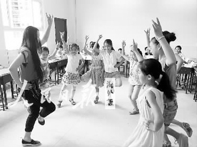 在课堂上,志愿者指着挂在黑板上的世界地图,讲解世界风情,分享志愿者当年刚到外国时遇到的文化碰撞和惊异。图为在美国斯特灵大学留学的吴忧(左一)教授小朋友苏格兰民族舞蹈“高地舞”。