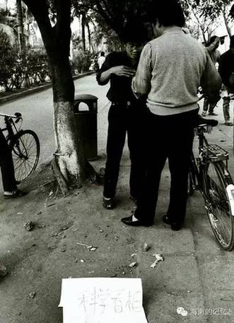 海口东湖路上的“科学看相”者在给人看相算命。摄于1989年2月。