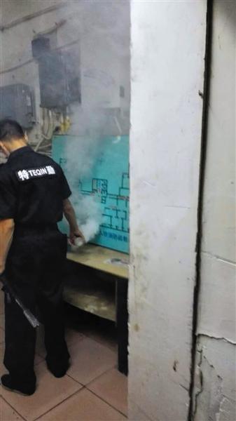 9日晚,受雇保安人员在地下室内点燃杀蟑烟剂。租户供图