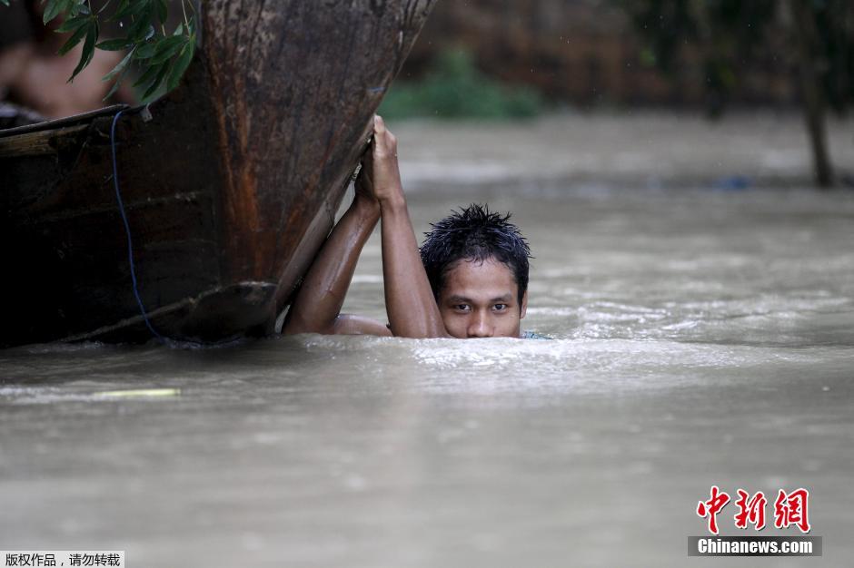 当地时间2015年8月7日,缅甸Nyaung Tone,一名男孩跳进水里,拖动木船行走。连日来,持续降雨导致缅甸14个省邦中的12个省邦遭受不同程度的水灾,造成数十人死亡。
