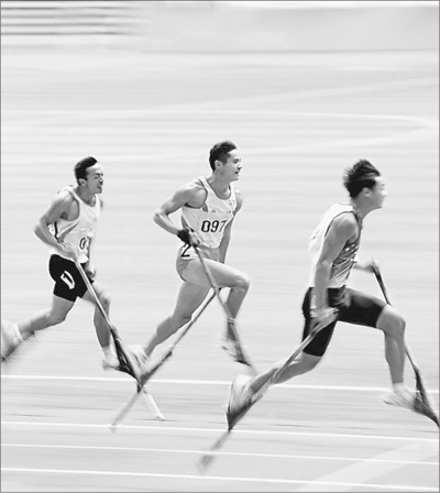 8月11日,在内蒙古鄂尔多斯东胜区全民健身活动中心体育场内,伴着数千名到场观众的助威声,起初记者并没有发现民族运动会高脚竞速的运动员有什么“异样”,然而,当发令枪响起,运动员飞快地跑过媒体看台前,记者才看清,这些飞奔的运动员真的是踩在高跷上奔跑的。