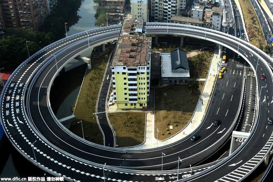 2015年8月11日,广州市海珠区永兴街28号,两栋“钉子户”被洪德立交桥呈360度包围,成为奇特的“圈中楼”景观。一个景象,2个楼房被洪德立交所围,成为圈中楼,所有经过这个路段的车辆都可以看到这2栋楼的情况,成为这个路段的一个奇特景观。日夜交替,如梭的车流宛如时光的印记将旧时代困在其中。