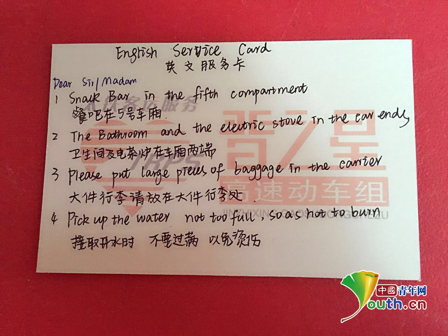 G606次二组为乘车的外国游客提供“英文服务卡” 陈夏供图