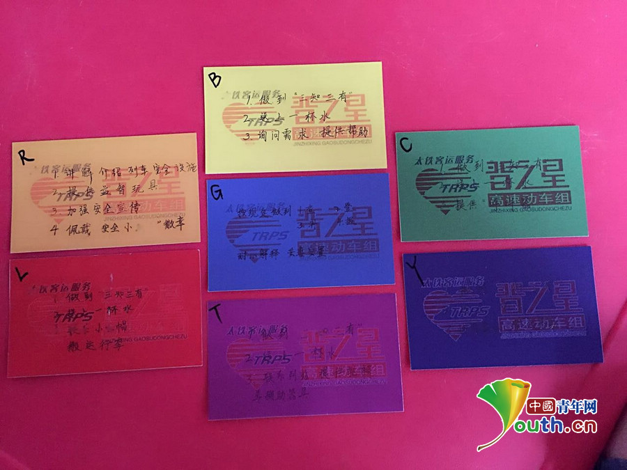 G606次二组乘务员陈夏创新总结出“彩虹服务法”,每一种颜色卡片都根据不同的重点旅客量身定做出针对性的服务方法 陈夏供图